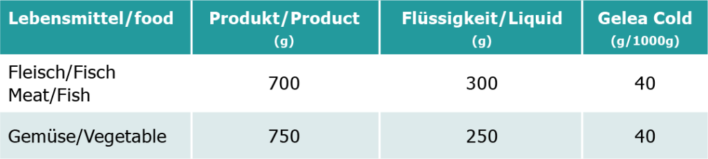 Mixer finement la viande ou les légumes et ajouter GELEA cold selon les instructions. Verser la purée dans les moules et congeler.