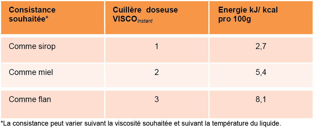 Donner le nombre de cuillère doseuse de VISCOinstant souhaitée dans une tasse ou un verre. Ajouter environ 100ml de liquide et remuer avec une cuillère. L’épaississement s’opère de 5 à 20 minutes. (Pour les boissons chaudes, ixer environ 30ml d’eau froide avec VISCOinstant avant de le verser dans la boisson chaude).