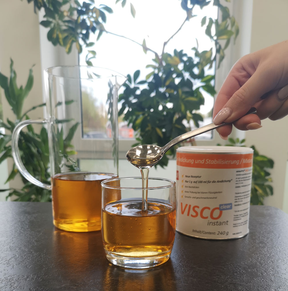 Außerdem sollte erwähnt werden, dass bei Flüssigkeiten, die mittels Stärke verdickt werden, keine gute Ergebnisse erzielt werden. Die Problematik ist bei Produkten, die mit Stärke angedickt werden, dass die Gerichte sich nach einiger Zeit wie Tapetenkleister verhalten und ein Genießen der Mahlzeit quasi nichtmehr möglich ist. Denn gerade bei der Nahrungsaufnahme spielen Optik und Textur eine sehr große Rolle. Daher sind die Produkte von biozoon wie VISCOclear Andickungsmittel bzw. Andickungspulver eine gute Alternative.