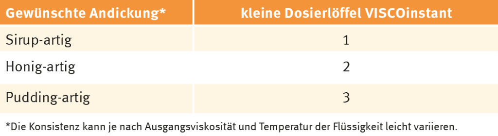 Entsprechende Anzahl an Dosierlöffeln VISCO instant in einen Becher oder ein Glas geben. Ca. 100ml Flüssigkeit zugeben und kurz mit einem Löffel umrühren. Die gewünschte Andickung erfolgt innerhalb von 5 min.